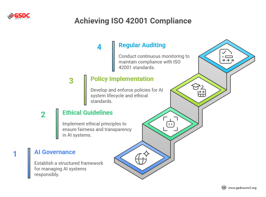 Compliance with ISO 42001 is a journey, one that involves setting up strong governance models, creating ethical guidelines, and developing clear policies for AI system development, deployment, and operation. Here’s a breakdown of the essential steps to achieving this compliance: