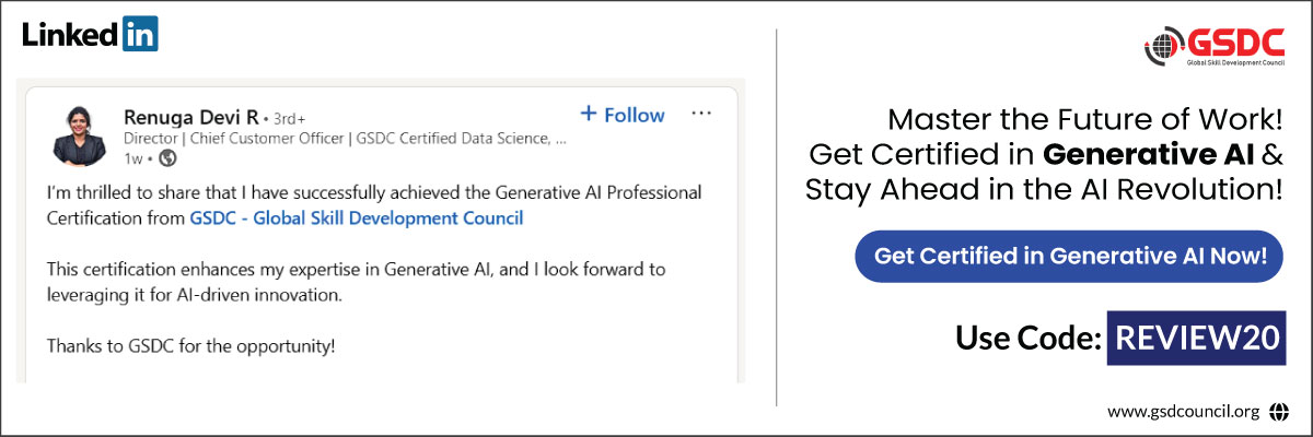 The Certified Generative AI Professional Certification from GSDC is a proof of proficiency in content creation and automation by AI, thus equipping anyone to exploit Generative AI in diverse industries.